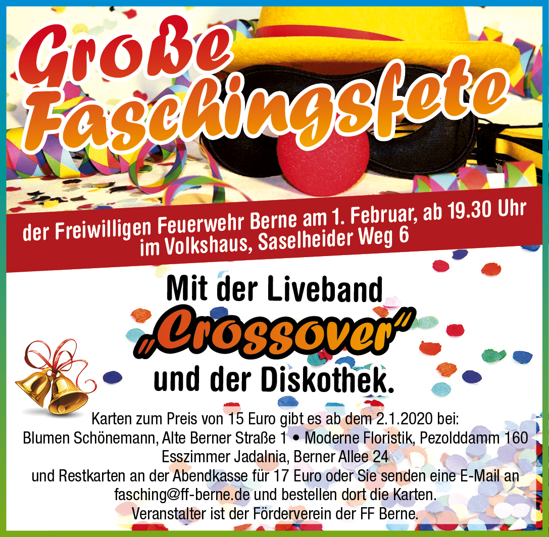 und Restkarten an der Abendkasse für 17 Euro. Oder senden Sie eine E-Mail an fasching(at)ff-berne(punkt)de und bestellen dort die Karten.